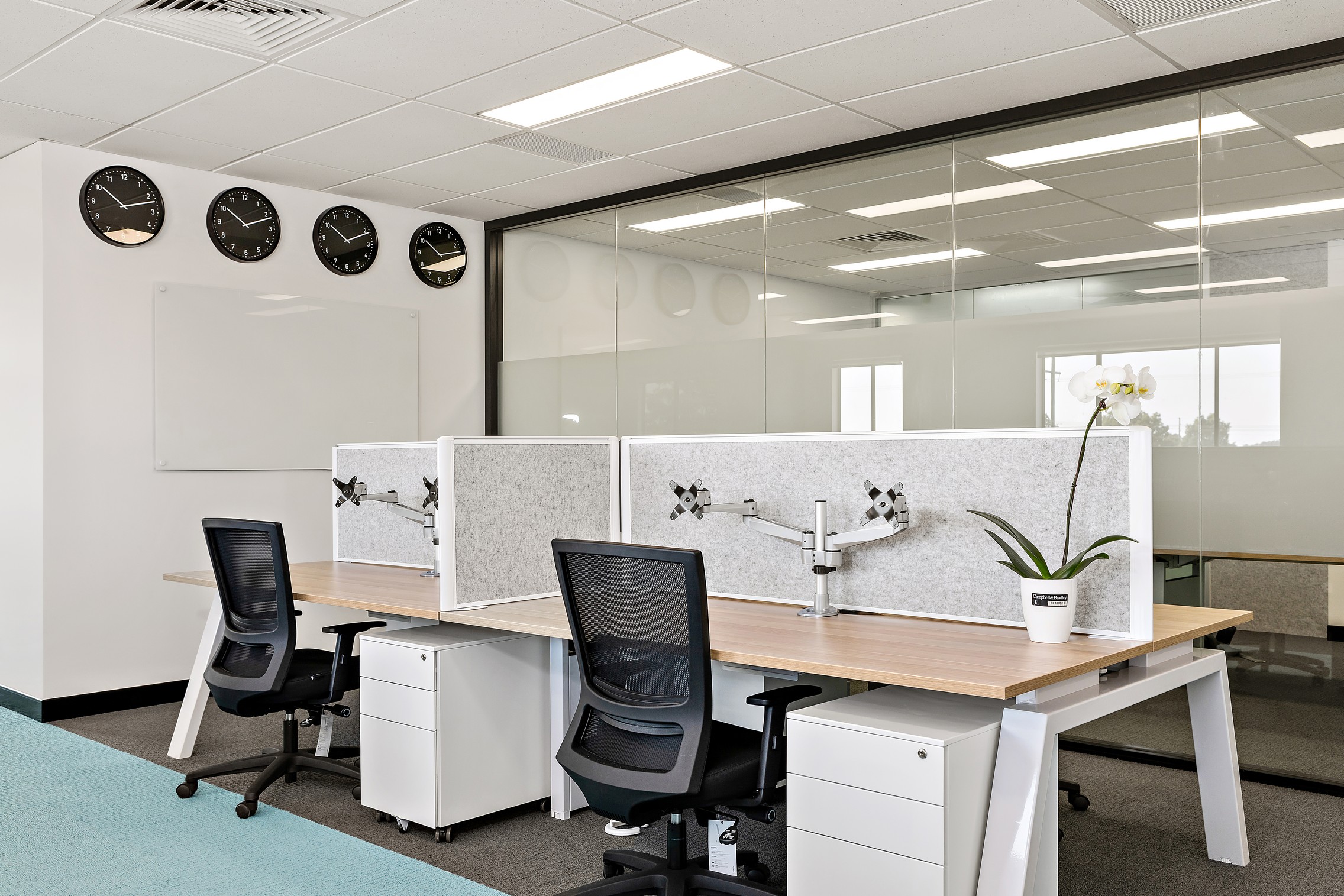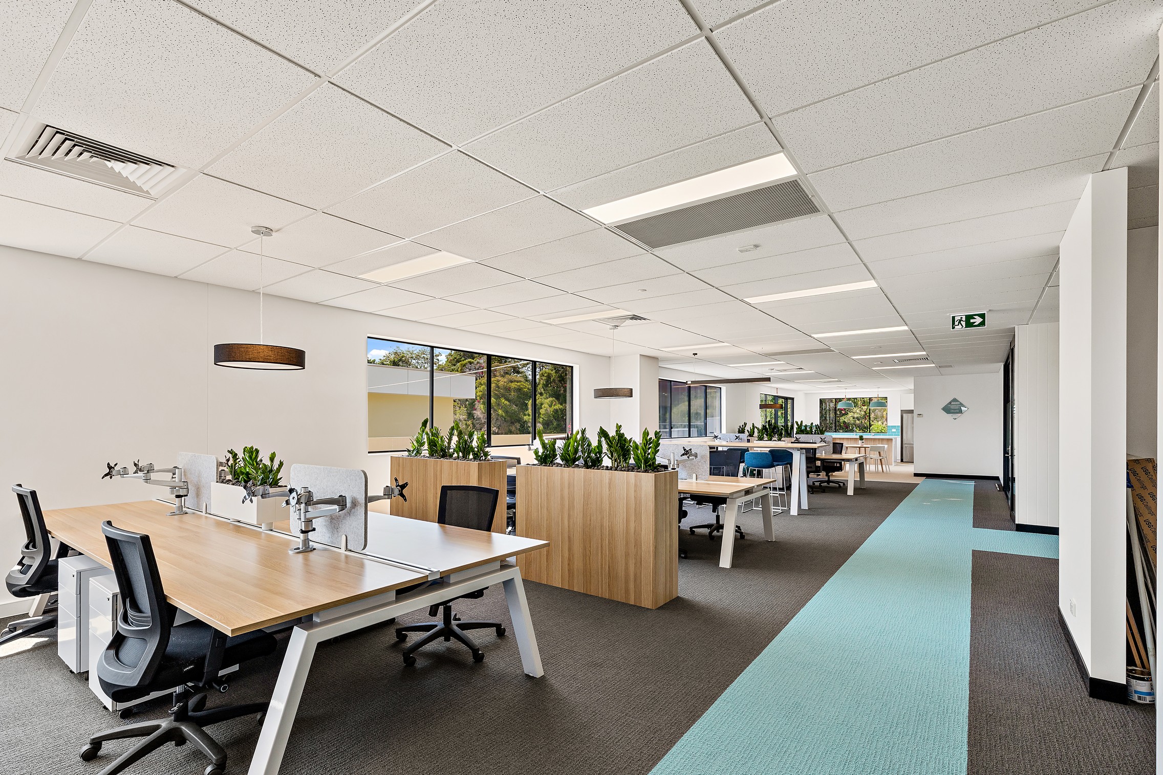 Our custom-built office fit out for Office HQ incorporated new joinery, carpet tiles, grid ceiling, partition glazing, acoustic panelling and feature wall battens. These updates give the office a refreshed, modern look, accurately representing the company. We collaborated with Office HQ to design an office space that promotes positive company culture and collaboration, and this office fit out does just that!  We transformed this office fit out by featuring the company’s signature colours, adding greenery throughout the office, creating an open office space to promote collaboration opportunities, incorporating privacy screens on desks for employee productivity and installing a functional kitchen for daily use. We also built private offices and board rooms using suitable acoustic materials to prevent unwanted noise, increasing productivity.