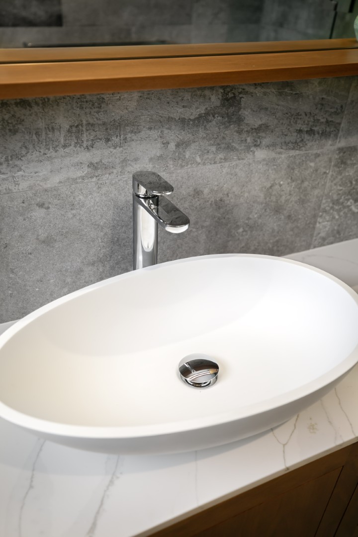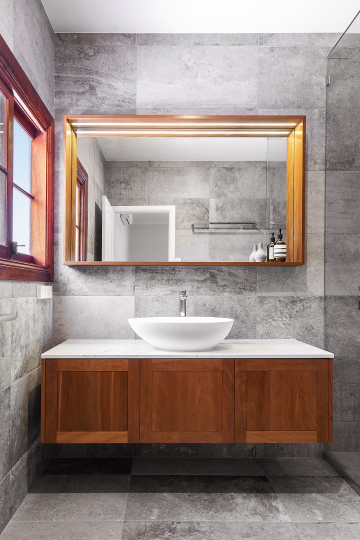 A vibrant rising sun across the awing welcomes guests inside, where a mandarin-toned tiled counter and golden glowing ‘sun’ light feature take centre stage – Hais Design.