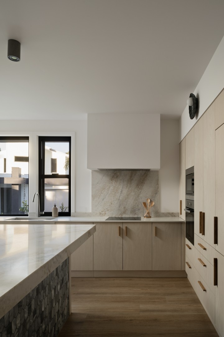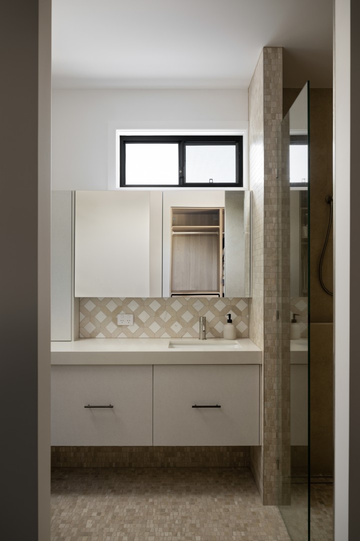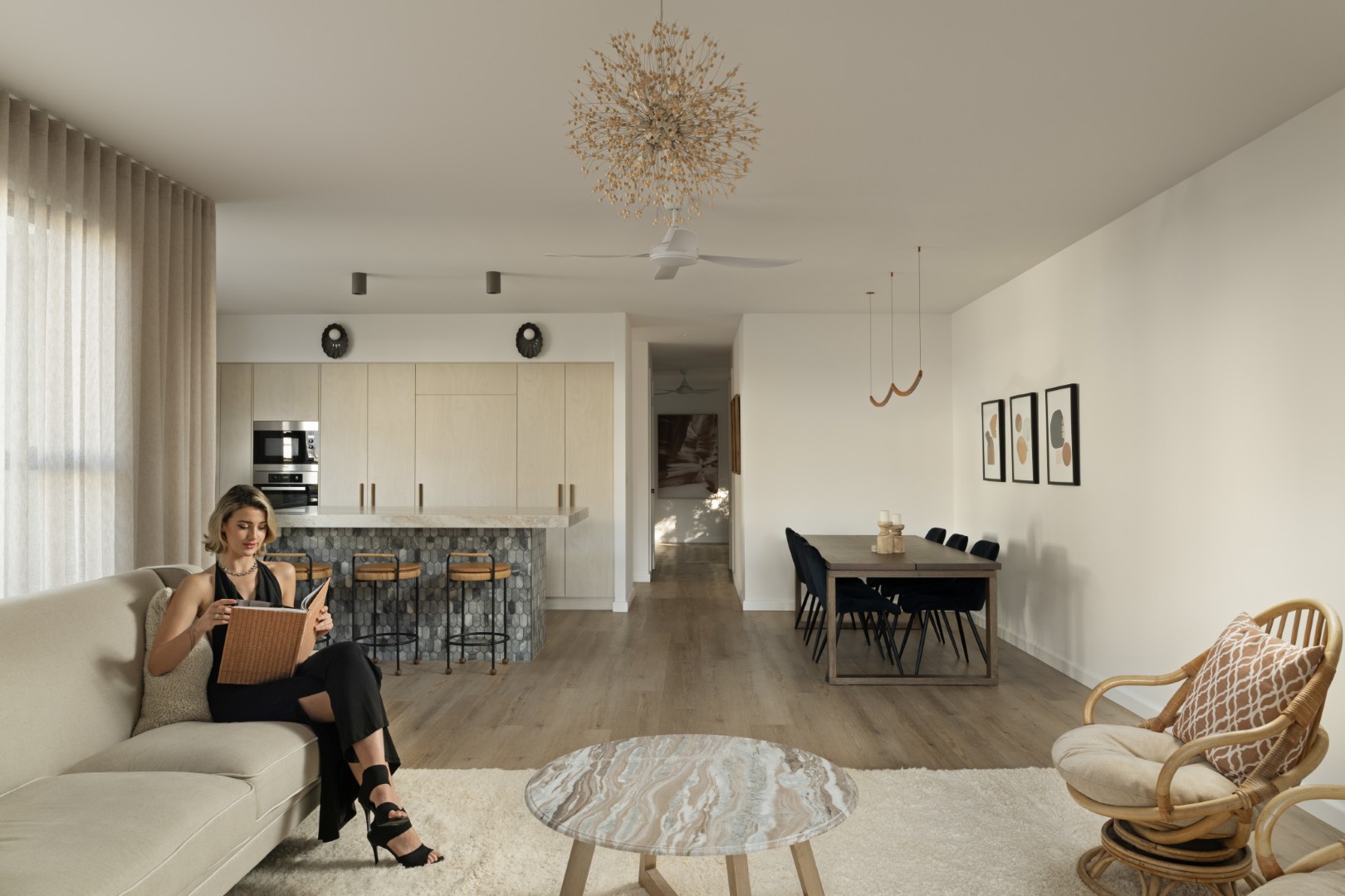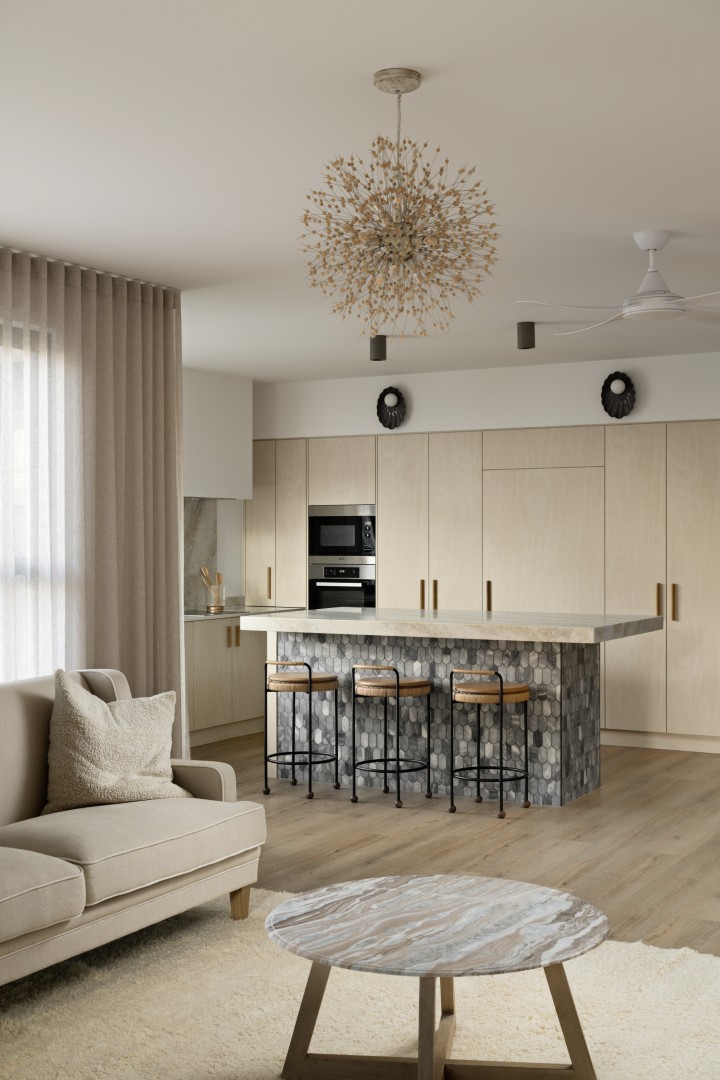 A vibrant rising sun across the awing welcomes guests inside, where a mandarin-toned tiled counter and golden glowing ‘sun’ light feature take centre stage – Hais Design.